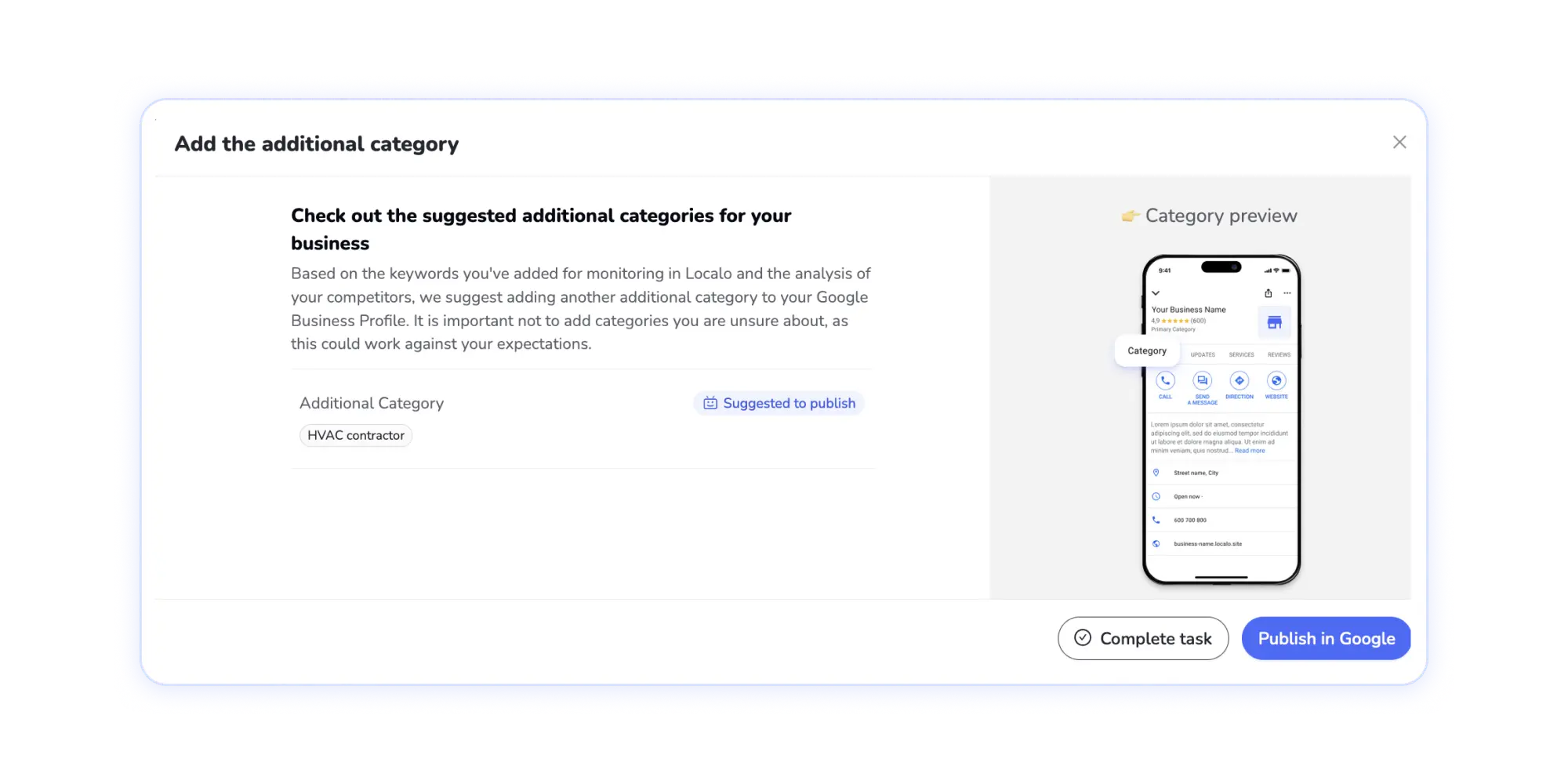 In Localo: In seconds, youâll know which secondary categories your competitors use to outrank you on Google Maps. Add the ones that most closely match what you do for your business, and youâre done!