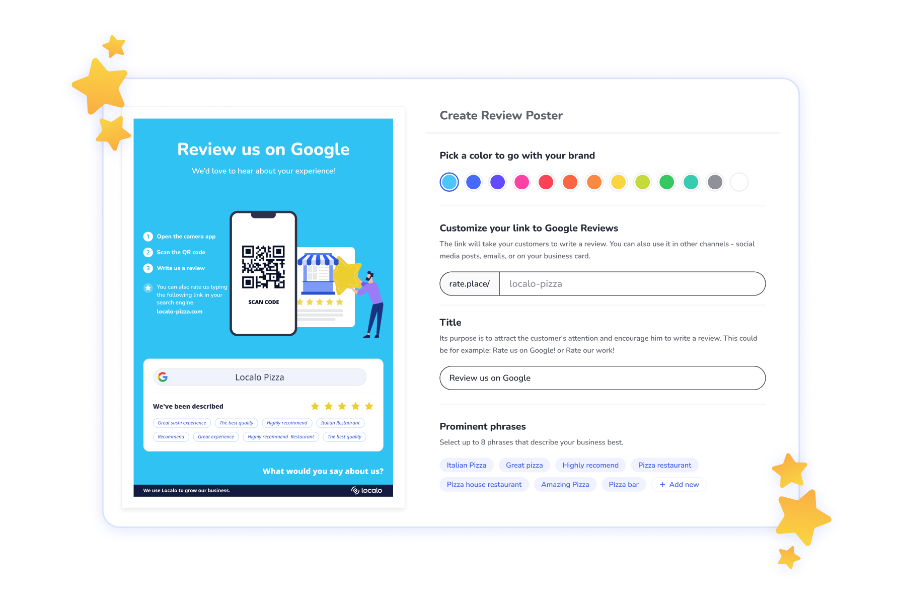 TheGoogle review poster from Localo is a solution that will handle reviews for your business. In 30 seconds, you will prepare a poster, which you can then, for example, stick on the wall, door, put on the counter, give to customers to order, or add to the menu in the restaurant - use it however you want. That’s all, from now on, you will get reviews much easier :)