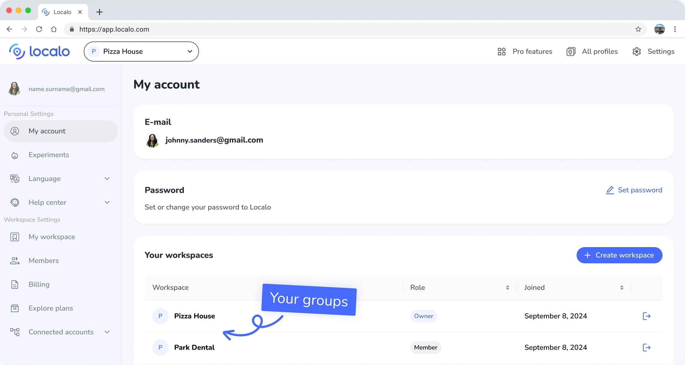 Don’t see workspaces? That’s normal – we’re rolling out gradually. Message us through the in-app chat or email support@localo.com and we’ll enable them within 24 hours!