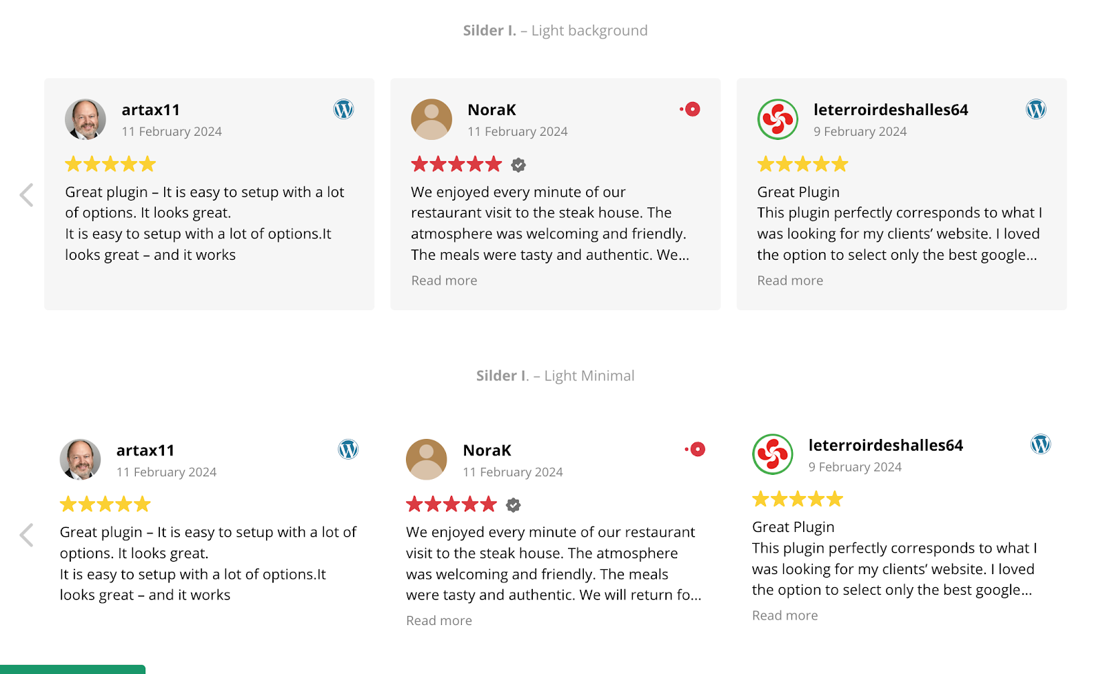 Das Widget für Google-Rezensionen ist ein benutzerfreundliches und kostenloses WordPress-Plugin, das ausschließlich dazu dient, Google-Rezensionen zu präsentieren. Obwohl es leichtgewichtig ist, bietet es mit 40 Widget-Layouts und 25 Designs umfangreiche Anpassungsmöglichkeiten, sodass Rezensionen in einem Karussell, Raster, einer Liste und mehr angezeigt werden können.