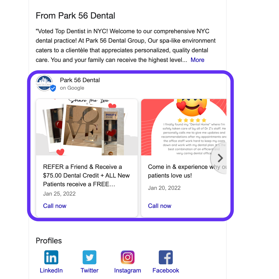 Google-Posts bieten einen Ort, an dem Sie kurze Inhalte erstellen und veröffentlichen können, die über verschiedene Veranstaltungen, Produkte, Dienstleistungen und Ereignisse in Ihrem Unternehmen informieren. Geschäftsinhaber verwenden sie oft auf die gleiche Weise wie Facebook-Posts, aber in diesem Fall erscheinen die Posts in der Google-Suche und der Google Maps-App. Sie können jedem Post Bilder, Videos, Text, Handlungsaufforderungen und einen Link zur Landingpage Ihrer Website hinzufügen.