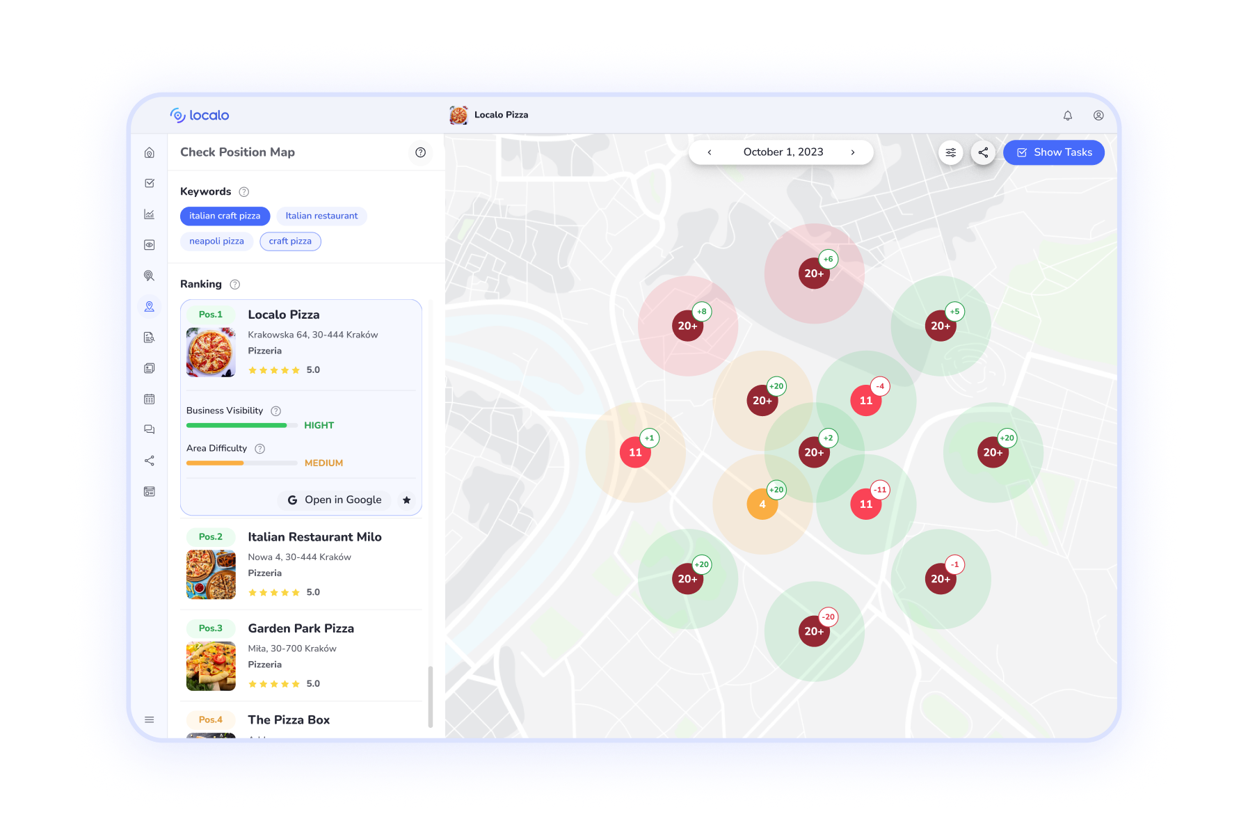 Bleiben Sie wachsam und reagieren Sie sofort auf Veränderungen. Mit dem Local Rank Tracker von Localo sind Sie ständig am Puls der Zeit, genauer gesagt, Sie haben immer im Blick, wie sichtbar Ihr Unternehmen bei Google ist und wie es im Vergleich zur Konkurrenz abschneidet. Null manuelle Arbeit. Localo überprüft von Zeit zu Zeit die Position Ihres Unternehmens, zeichnet sie auf und informiert Sie darüber hinaus darüber, wo Ihr Unternehmen an einem bestimmten Tag oder in einer bestimmten Woche steht. Es steht ganz oben auf der Liste der Tools für kleine Unternehmen und SEO-Tools.