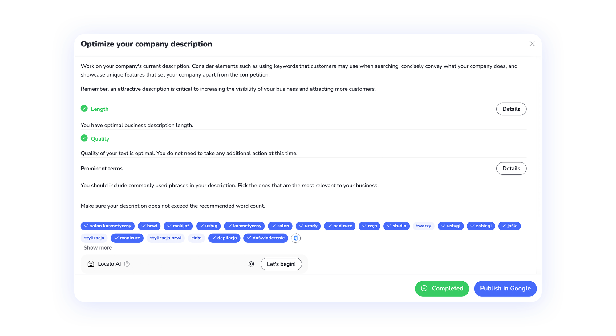 In Localo: Das Tool analysiert sorgfältig jeden Ihrer großen Konkurrenten und überprüft, welche genauen Wörter sie in der Beschreibung verwenden, die ihr Unternehmensprofil verbessern und sie in Google Maps auf die vordersten Plätze bringen. Danach ist es Ihre Aufgabe, eine Unternehmensbeschreibung zu erstellen, die die potenzielle maximale Anzahl dieser Wörter enthält, die auch zu Ihrem Unternehmen und seinen Tätigkeiten passen sollten.