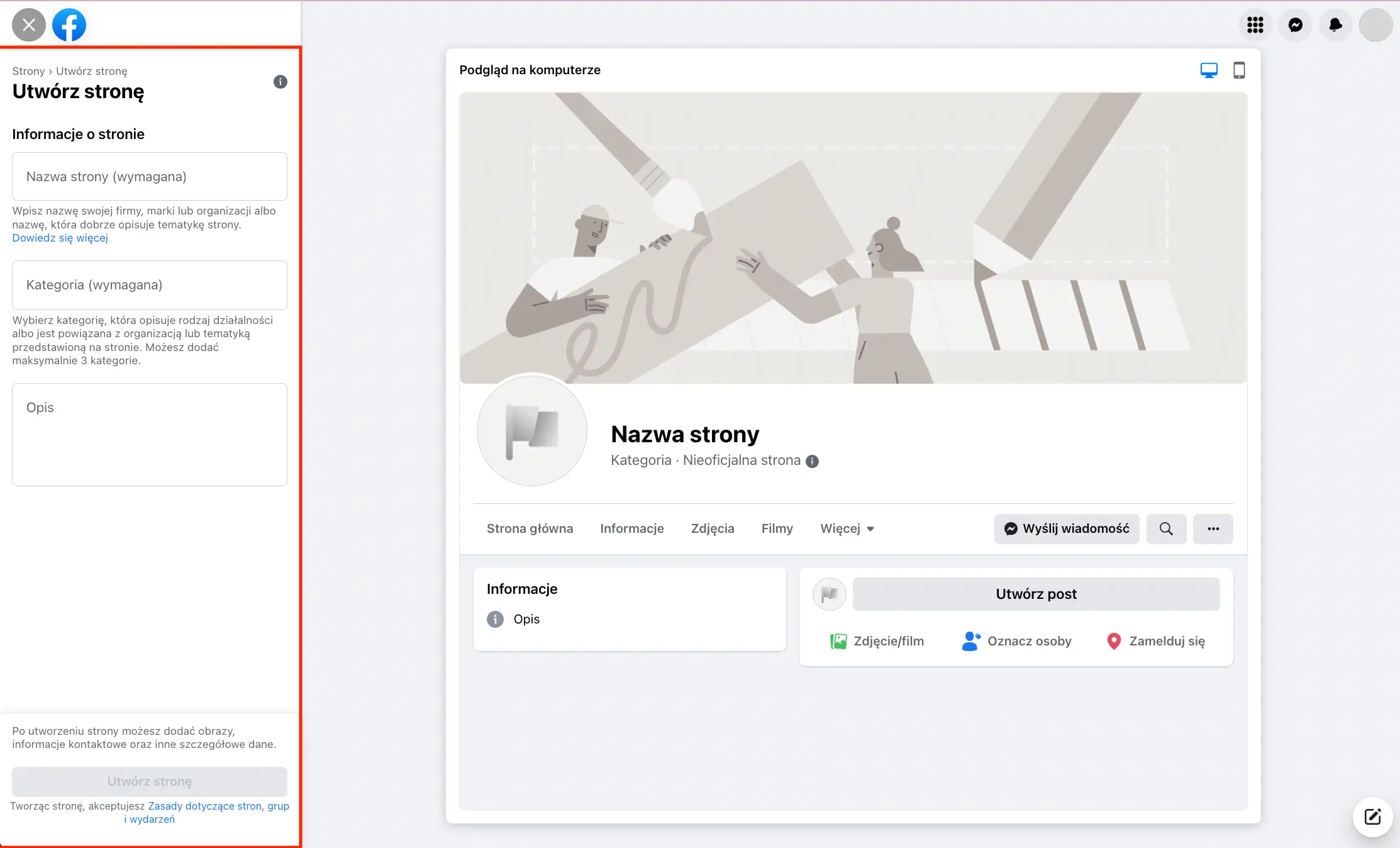 - Geben Sie zunächst die erforderlichen Informationen ein: den Namen der Seite, die entsprechende Kategorie und eine kurze Beschreibung. Klicken Sie auf „Seite erstellen“ und schließlich auf „Speichern“. Als Seitenadministrator können Sie die Einstellungen der Facebook-Seite jederzeit ändern, z. B. den Namen Ihres Unternehmens oder das Profilbild.