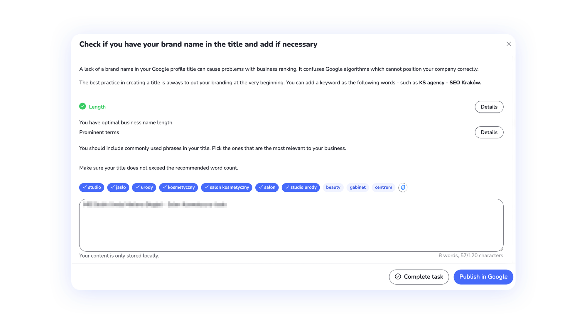 En Localo: Inmediatamente obtendrá una indicación de si el Título de su empresa es lo suficientemente largo y qué palabras en el Título son utilizadas por sus competidores que están por delante de usted y son líderes en el ranking de Google Maps.