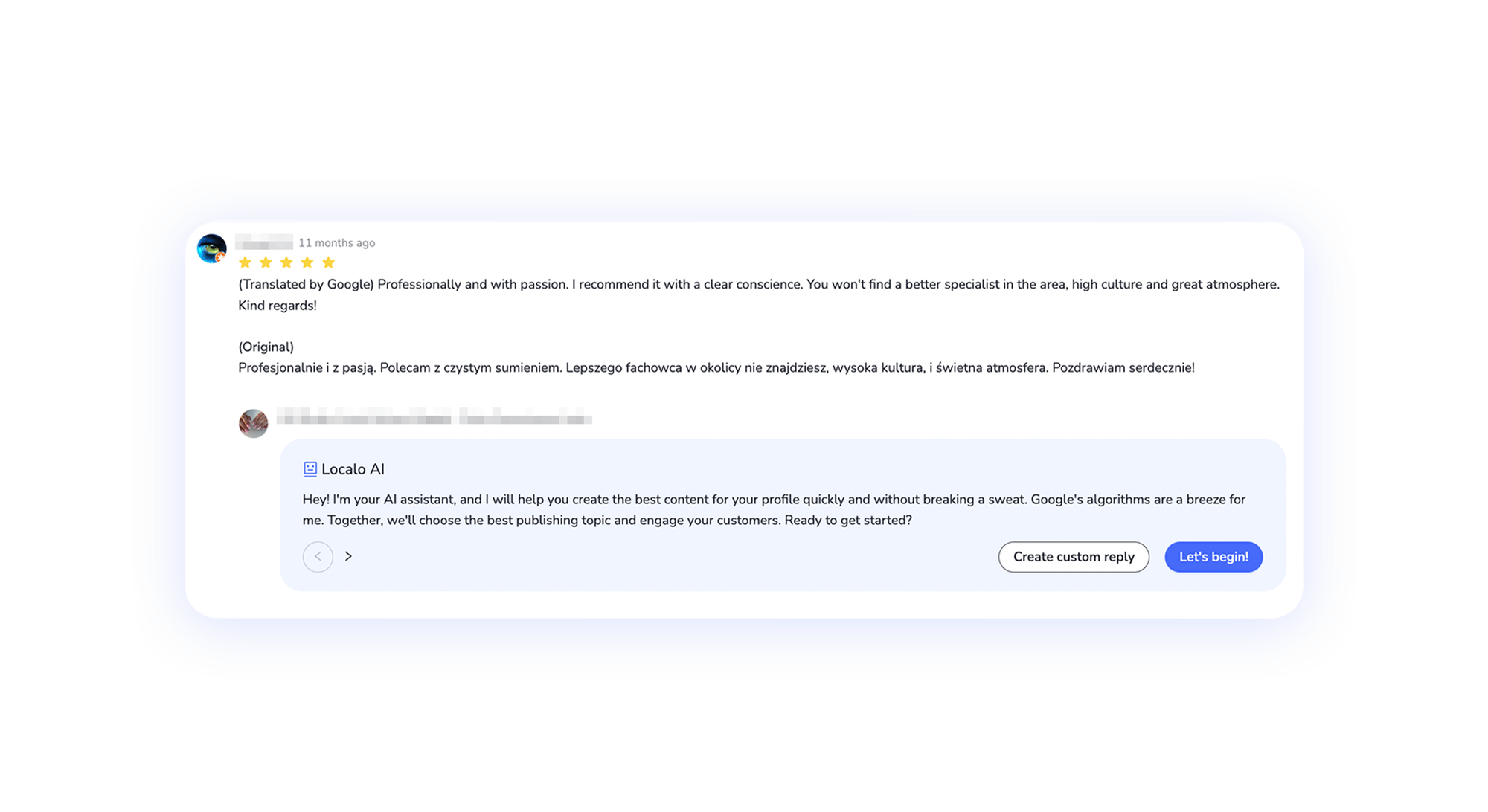 En Localo: Puedes responder a las opiniones de los clientes con un solo clic, utilizando contenido personalizado como el nombre del crítico. Esta opción te ahorra mucho tiempo y energía que habrías tenido que dedicar a pensar qué responder al cliente. Además, puede crear sus respuestas personalizadas en la herramienta, que podrá utilizar con la misma facilidad más adelante.