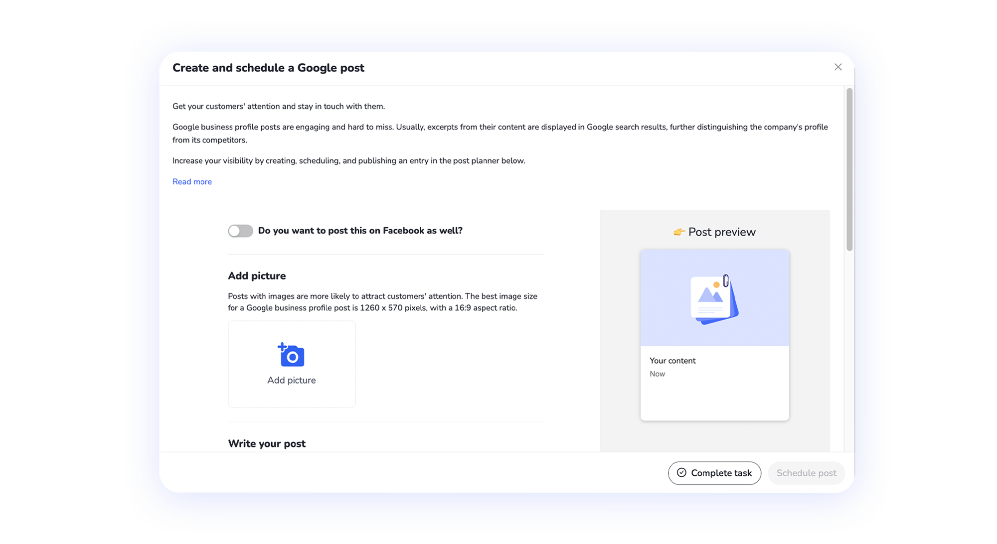 I Localo: Obtienes directrices ya preparadas sobre cuándo publicar un post en el perfil de tu empresa y qué palabras deben figurar en él. Además, tienes acceso a una fantástica función, que es programar publicaciones .