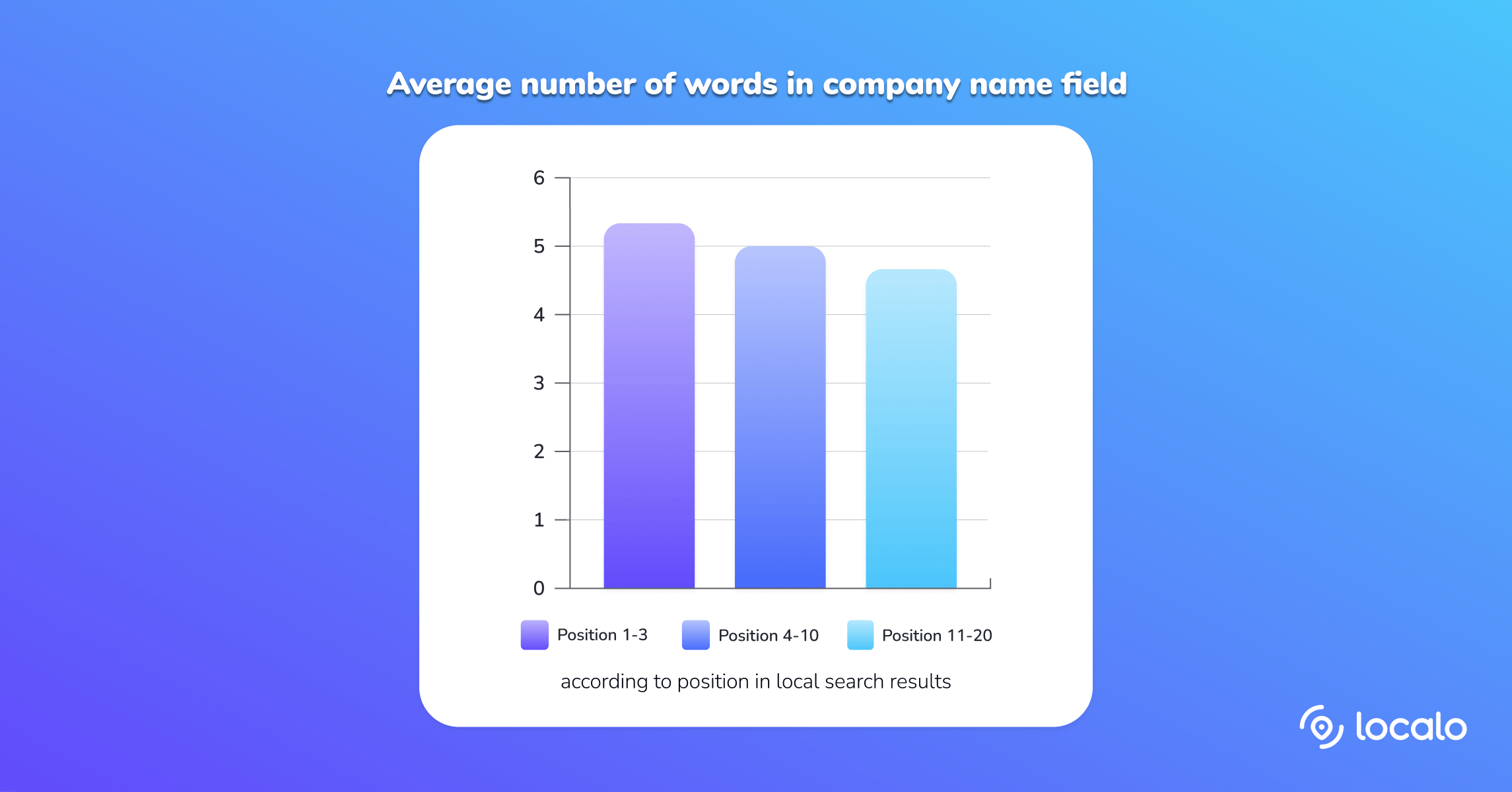 Como parte de nuestro estudio, decidimos ver si existe una correlación entre el número de palabras en el nombre del perfil de una empresa y la posición en los resultados de búsqueda locales. El siguiente gráfico muestra el número medio de palabras en el campo del nombre de una empresa en Google.