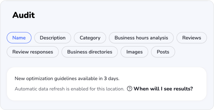 Recibe auditorías de SEO local automáticas cada semana. Configura una vez y solo vuelve por los resultados.