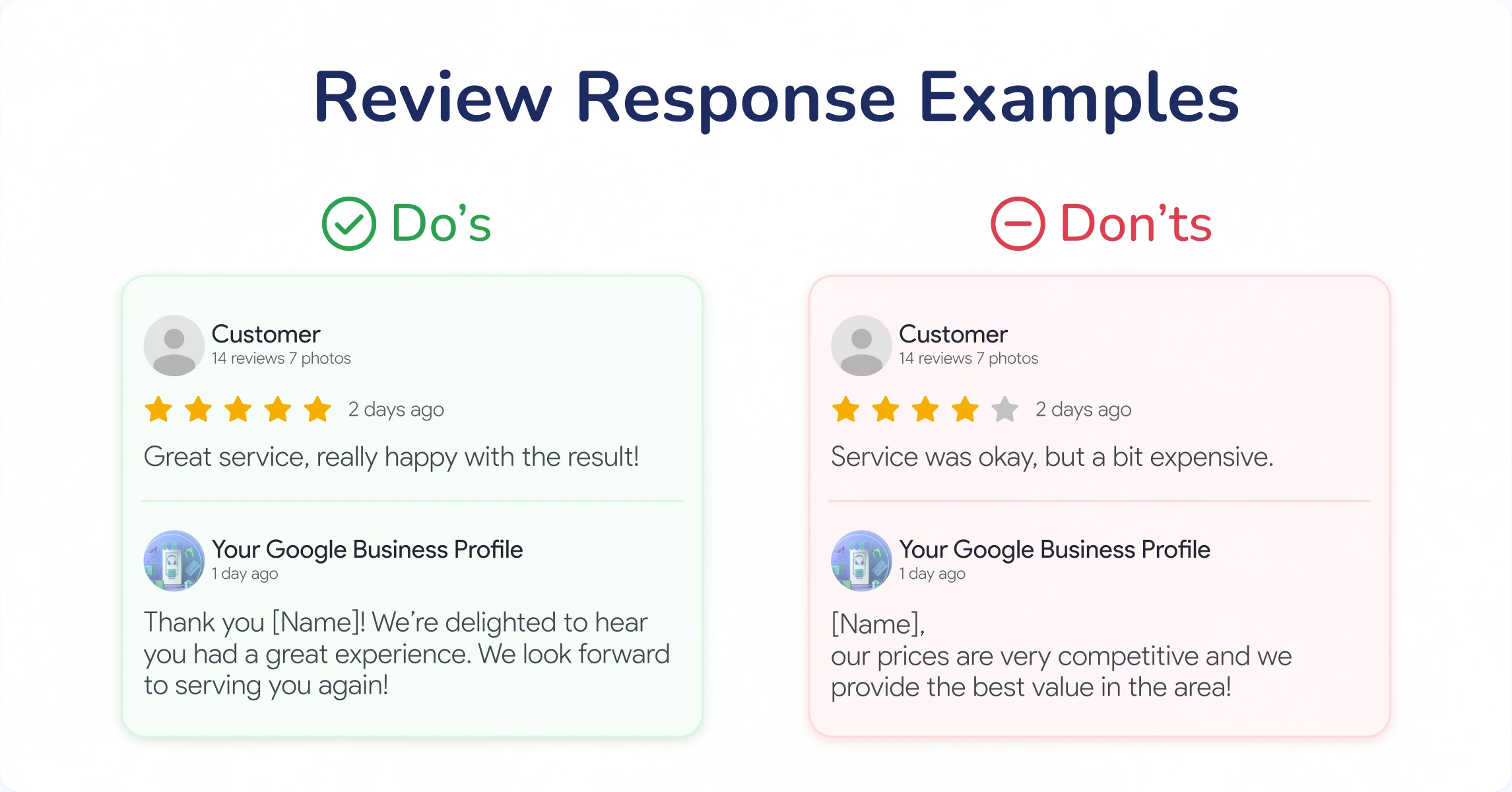 How you respond to reviews is almost as important as the reviews themselves. Data from Google shows that businesses that respond to reviews are considered 1.7times more trustworthy than businesses that don’t. This significant difference demonstrates how crucial active review management is for building consumer confidence. An effective review response strategy includes: Responding promptly to all reviews, both positive and negative. Personalizing your responses. Addressing specific points mentioned in the review. Thanking positive reviewers for their feedback. Responding professionally to negative reviews, acknowledging concerns, and offering solutions. Remember that your review responses are public—they’re not just for the reviewer but for everyone who reads that review in the future. A thoughtful response to a negative review can actually turn it into a positive by demonstrating your commitment to customer satisfaction.
