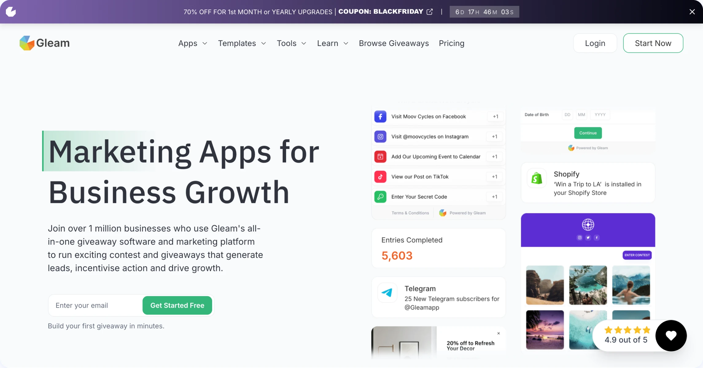 Gleam est une plateforme marketing qui aide les entreprises à organiser des cadeaux, des concours et des campagnes de récompenses pour développer leur public. Les fonctionnalités clés incluent une configuration de campagne facile, une collecte automatisée des participations, des analyses puissantes, la prévention de la fraude et des intégrations avec les principales plateformes sociales et par e-mail.