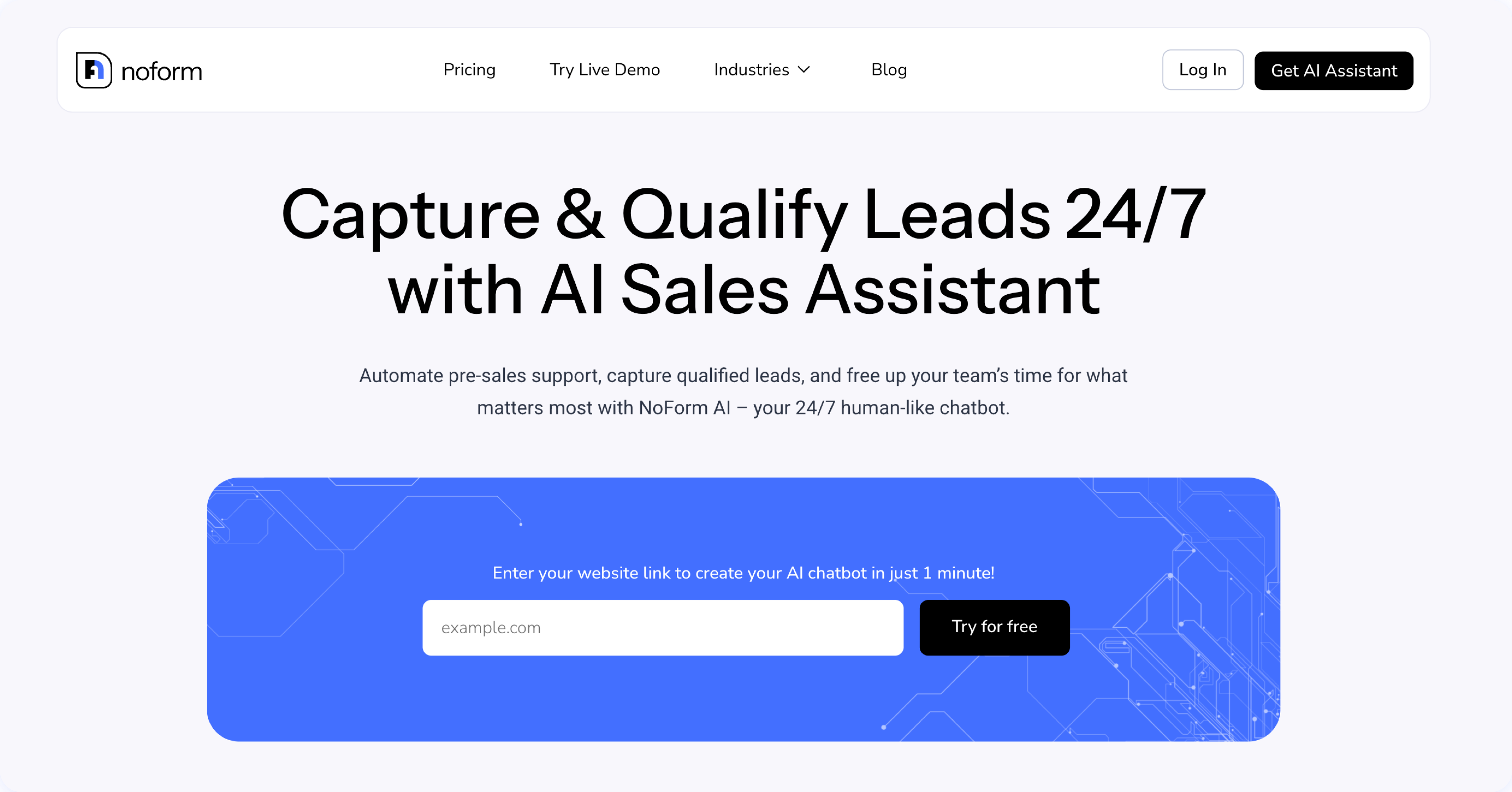 Noform AI est un assistant commercial IA 24/7 qui transforme les visiteurs du site Web en clients payants.
