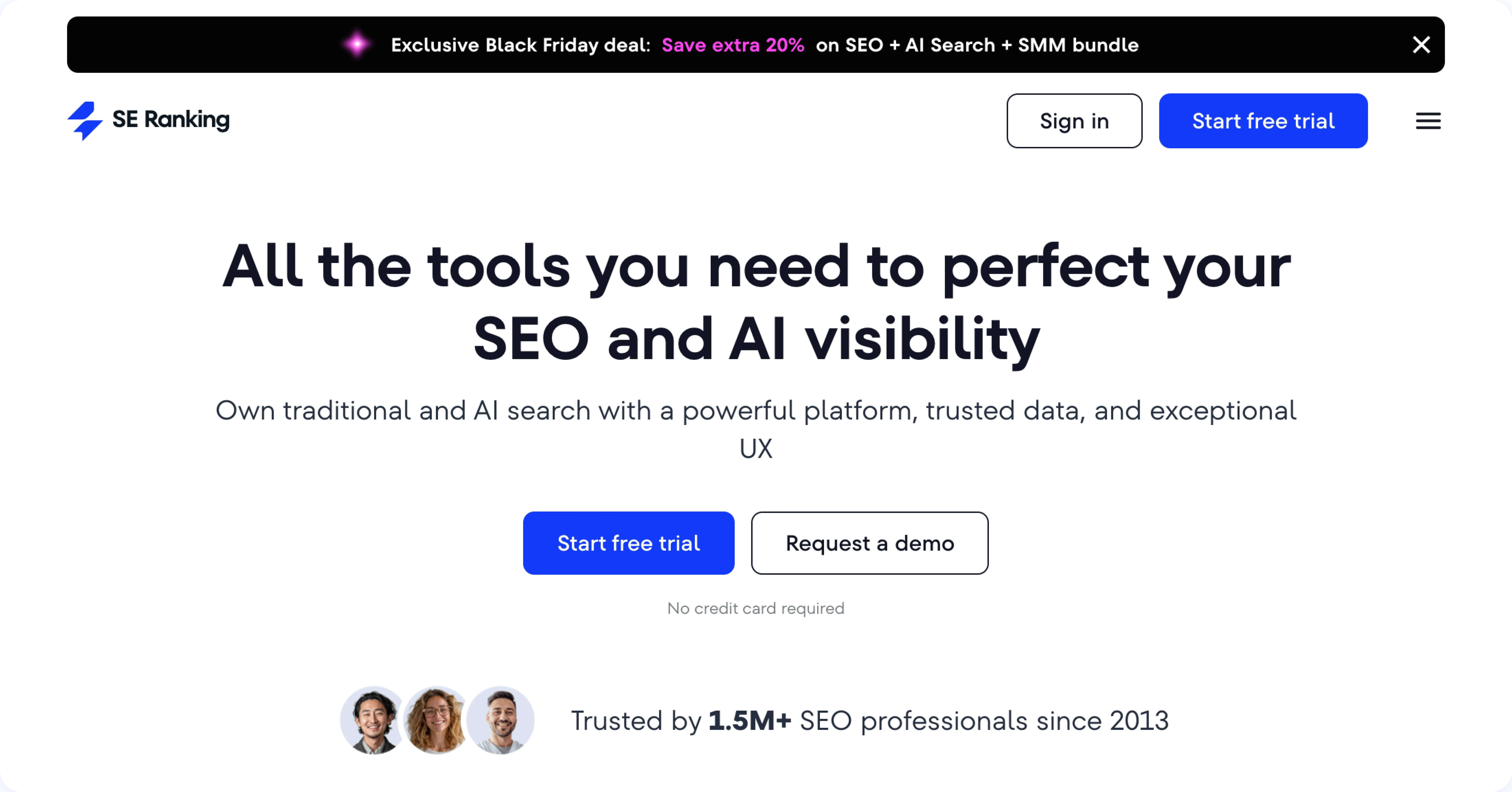 Ce Black Friday, SE Ranking offre une généreuse réduction de 20% sur tous les plans annuels et modules complémentaires, en plus de votre réduction annuelle de 20% toute l’année.