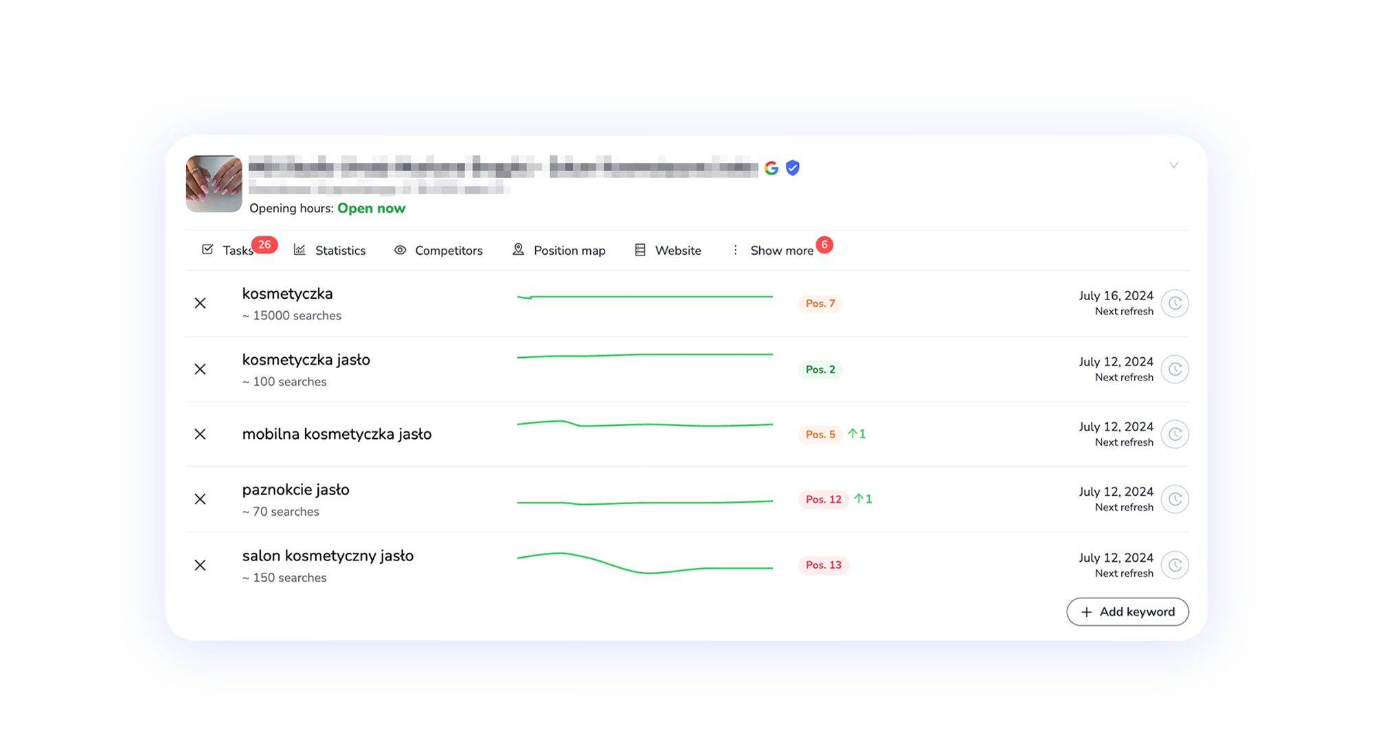 Dans Localo : Vous verrez combien de photos supplémentaires vous devez ajouter au profil de votre entreprise sur Google pour améliorer votre classement sur Google Maps. Gardez à l’esprit que vos concurrents travaillent en permanence et qu’aujourd’hui, il peut s’agir de dix photos, mais que dans un mois, ce sera peut-être 15, 20 ou plus. Surveillez cela régulièrement.