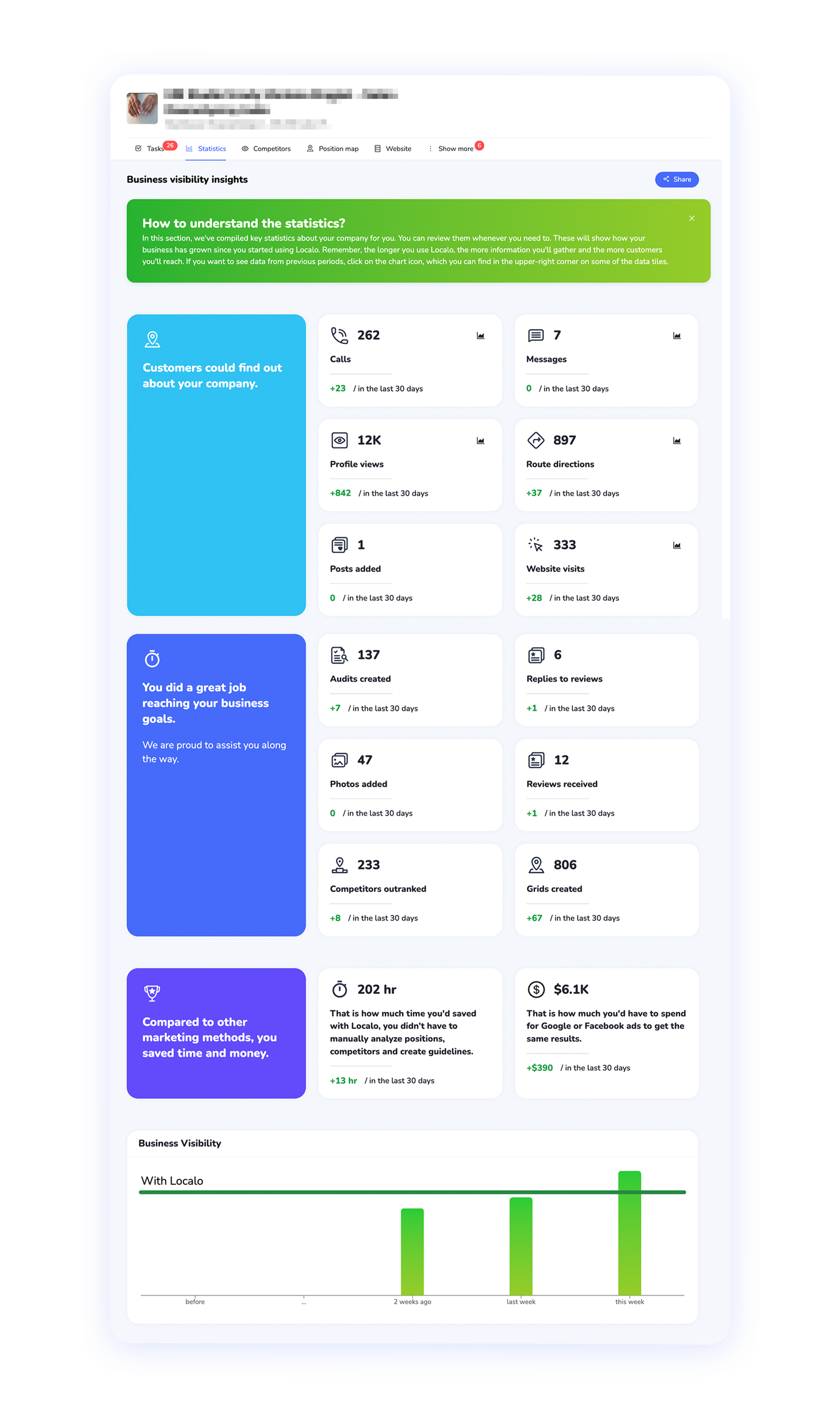 Dans Localo : Vous avez accès à une vue spécialement préparée et personnalisée de votre développement commercial, où vous pouvez voir comment votre entreprise se développe avec Localo, ce que vous avez gagné, combien vous avez économisé et ce que vous avez déjà fait.