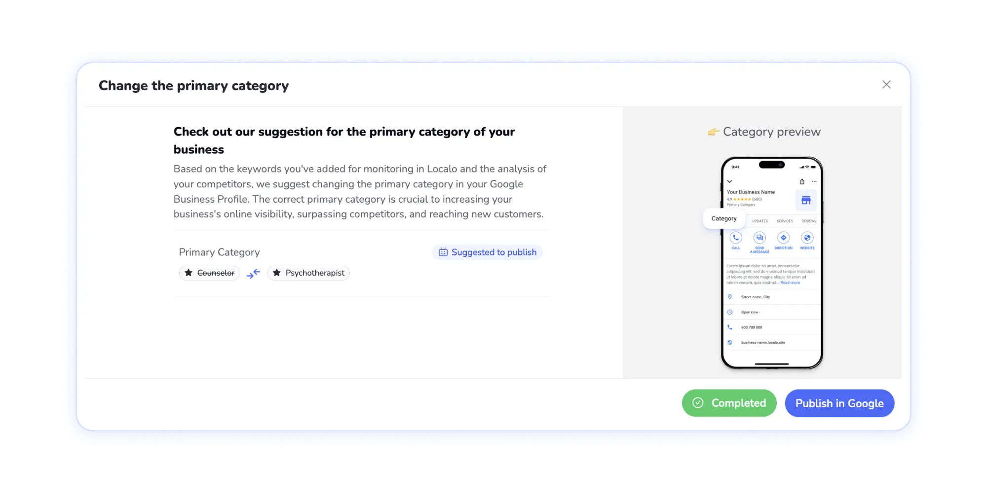 Dans Localo, vous saurez immédiatement quelle catégorie principale vos concurrents utilisent à tout moment, ce qui leur permet de conserver un classement élevé dans Google Maps. Définissez la catégorie principale suggérée par Localo. N’oubliez pas que tout ce que vous faites est dynamique et que vous pouvez avoir besoin de sélectionner une catégorie principale, une description, un titre, etc. différents au cours d’un trimestre. Gardez ceci à l’esprit.
