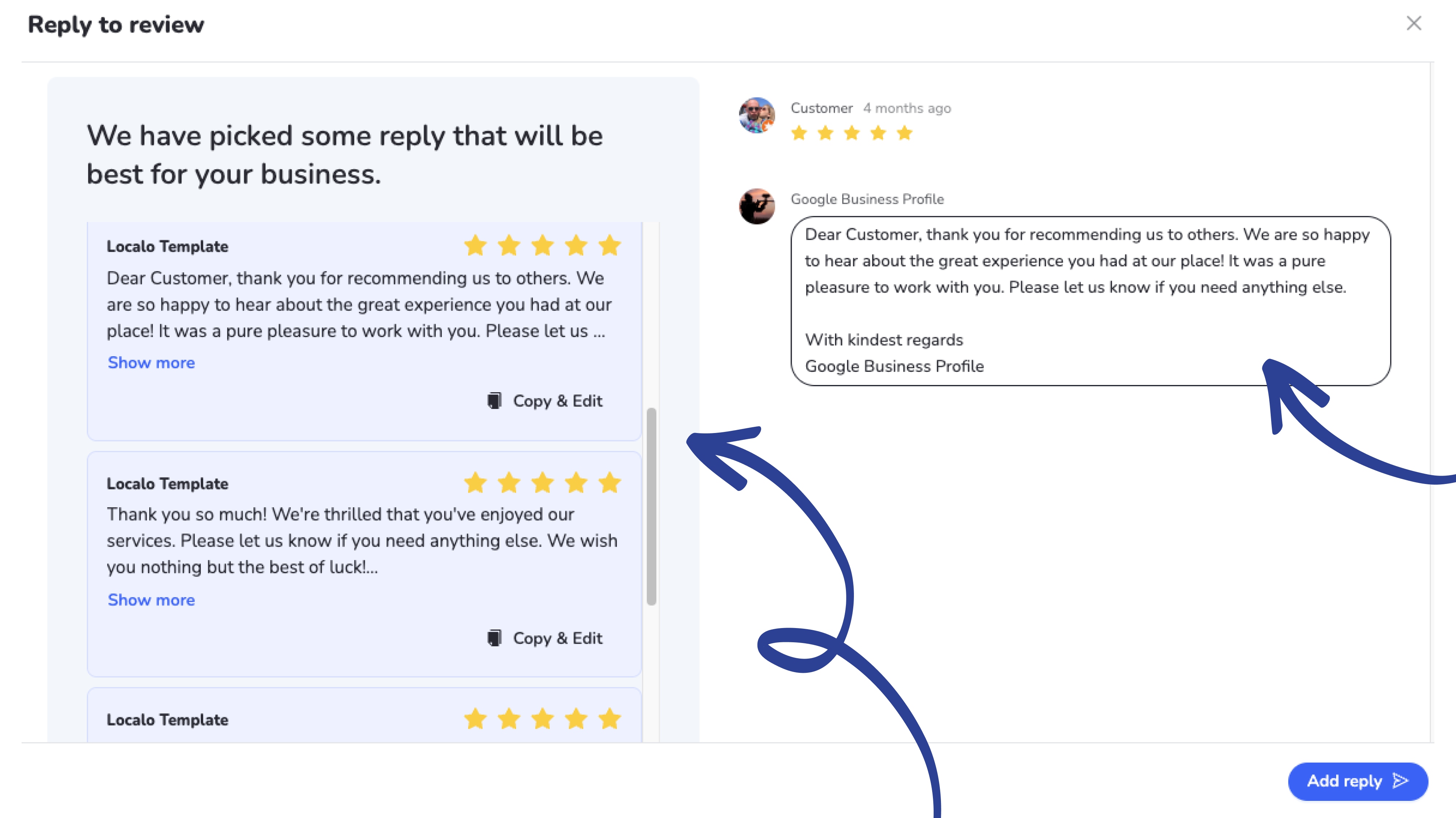 Bien entendu, si vous souhaitez modifier la réponse suggérée avant de la publier, vous pouvez le faire - vous avez un contrôle total sur le contenu. Le système veille à ce que chaque réponse soit adaptée au contexte de l’avis - qu’il s’agisse d’un remerciement pour un avis positif ou d’une réaction professionnelle à une critique.