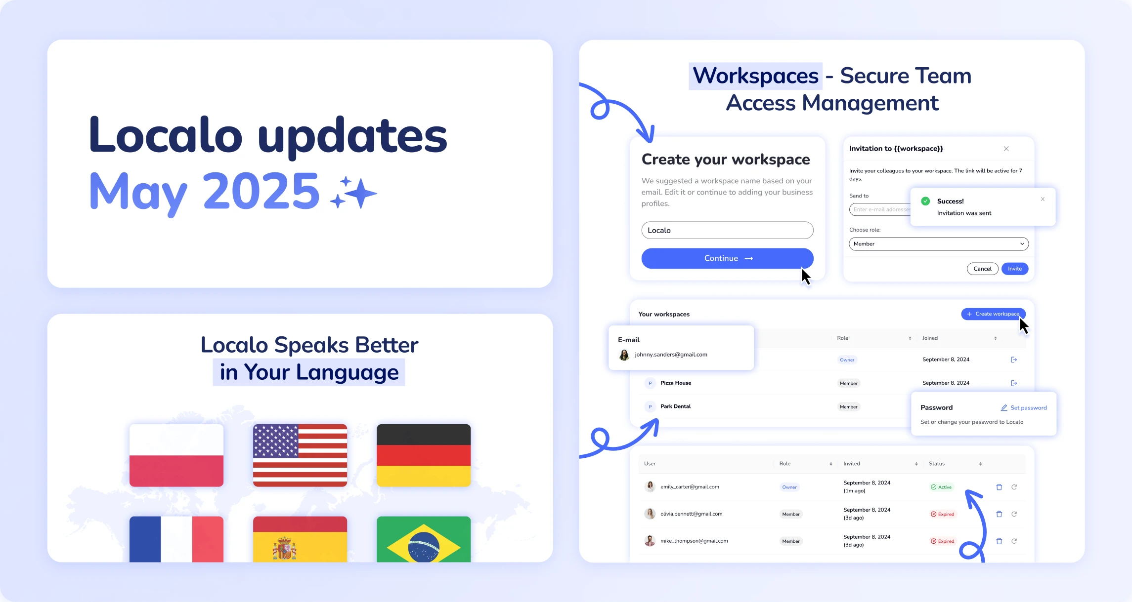 Mai a apporté des mises à jour vraiment révolutionnaires à Localo ! Nous avons introduit la fonctionnalité workspaces tant attendue – vous pouvez maintenant inviter des membres d’équipe à gérer les profils Google Business sans avoir à partager vos mots de passe personnels. De plus, nous avons mis à jour et affiné les traductions en six langues, vous permettant de travailler de manière fluide dans votre langue préférée – plus de barrières linguistiques, de messages confus ou d’erreurs grammaticales.