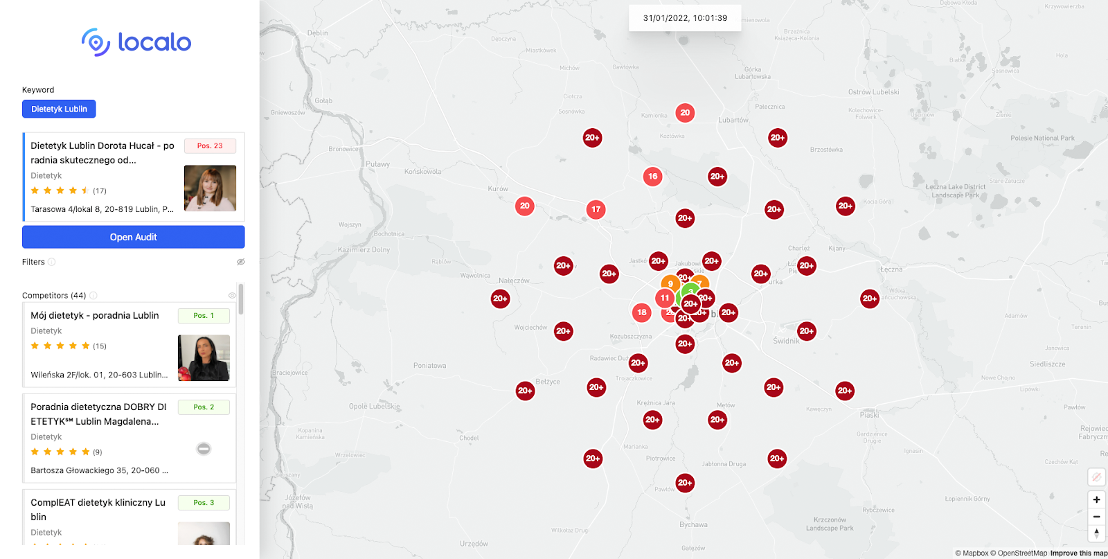 J’étais curieux de voir quelle était notre visibilité en ligne, car nous avons un site web et nous nous en sommes toujours occupés. Nous avons utilisé l’outil gratuit local rank checker et nous avons vu que ce n’était pas si mal. En fait, dans les endroits proches de nos localisations, c’était bien.