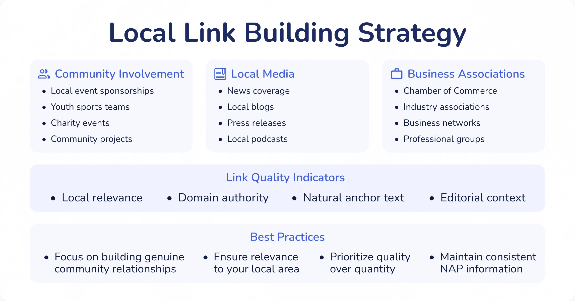 Think of local links as digital word-of-mouth recommendations. Just as a recommendation from someone in your community carries more weight than one from a stranger, links from locally relevant sources send stronger signals to search engines about your business’s local authority.