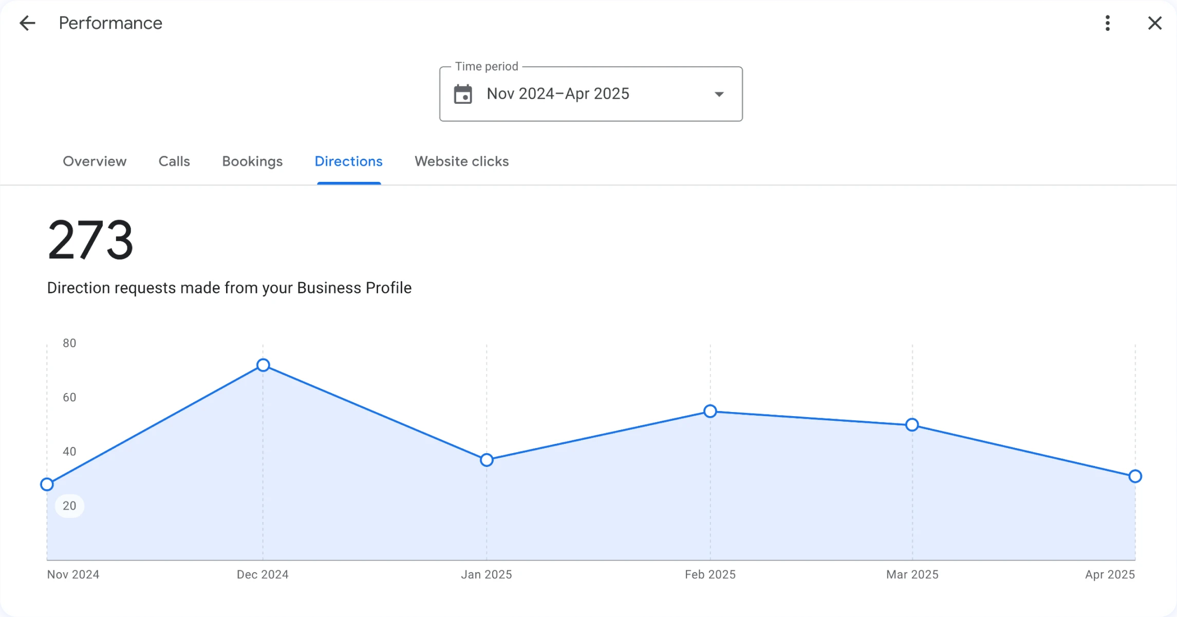 Access your Performance available in your Google Business Profile dashboard. The data typically covers the last six months and includes several key metrics: