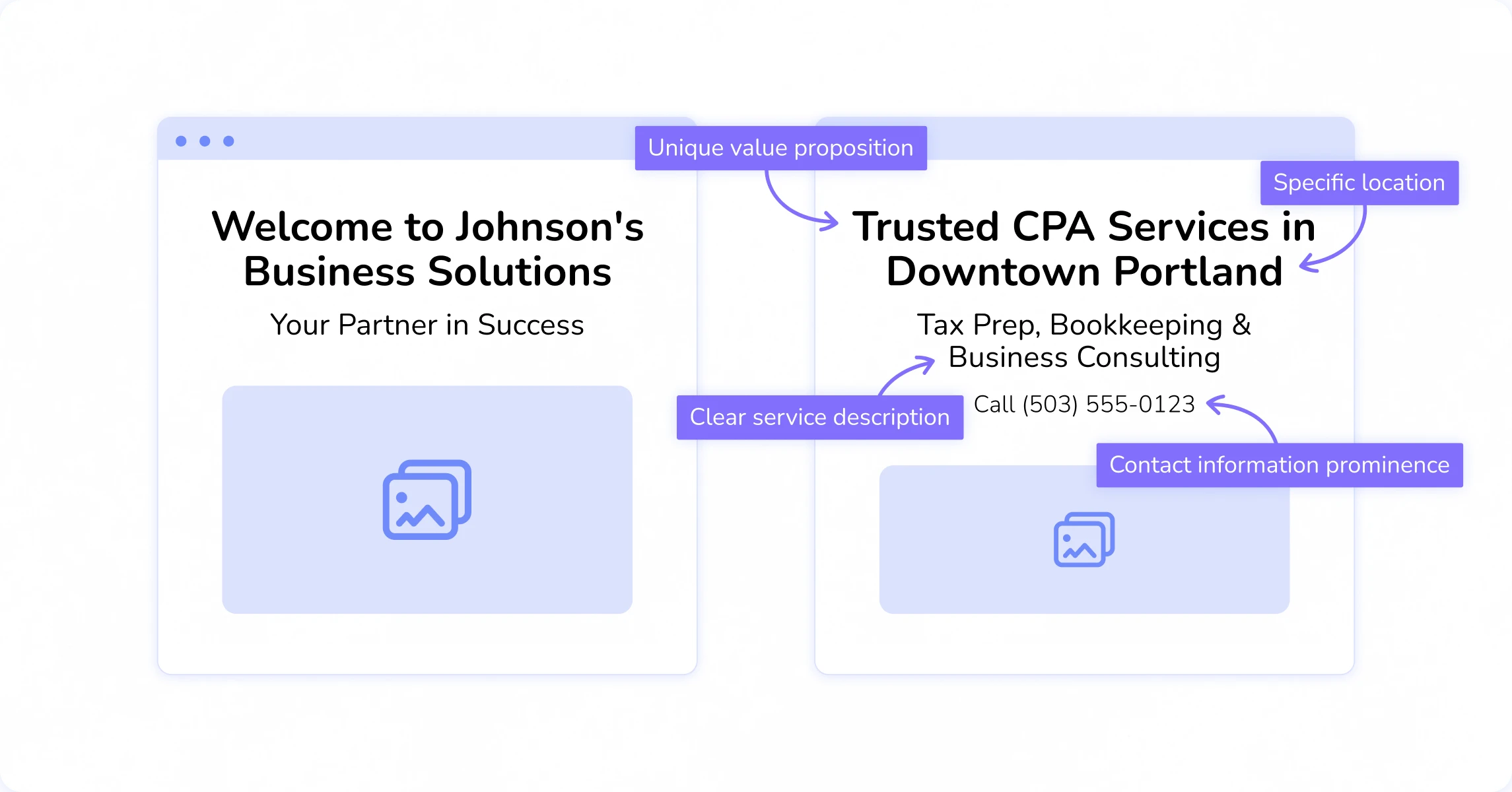 • After: “Trusted CPA Services in Downtown Portland - Tax Prep, Bookkeeping & Business Consulting - Call (503) 555-0123”