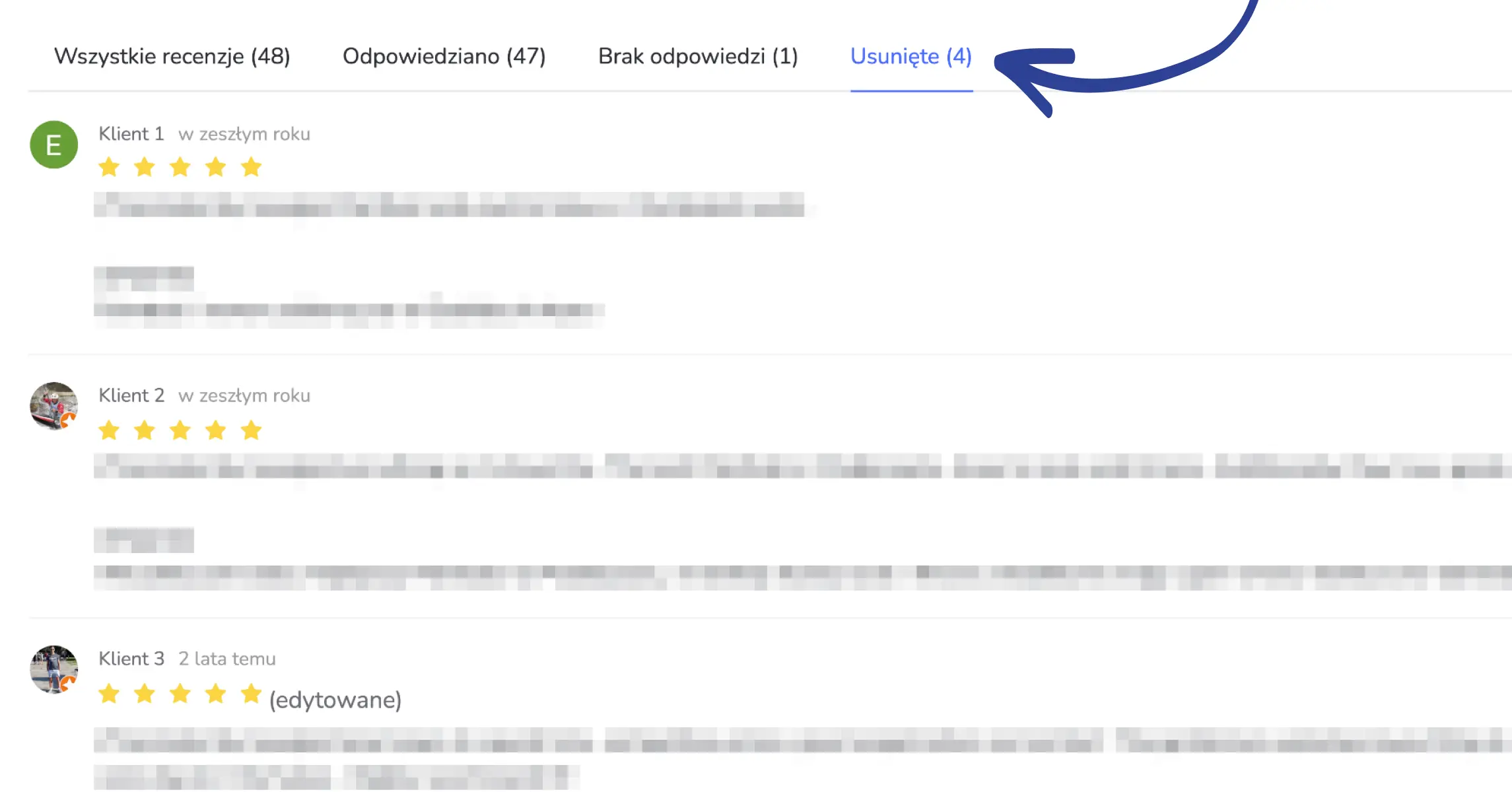 - śledzić usunięte recenzje w sekcji „Recenzje” w zakładce „Usunięte”