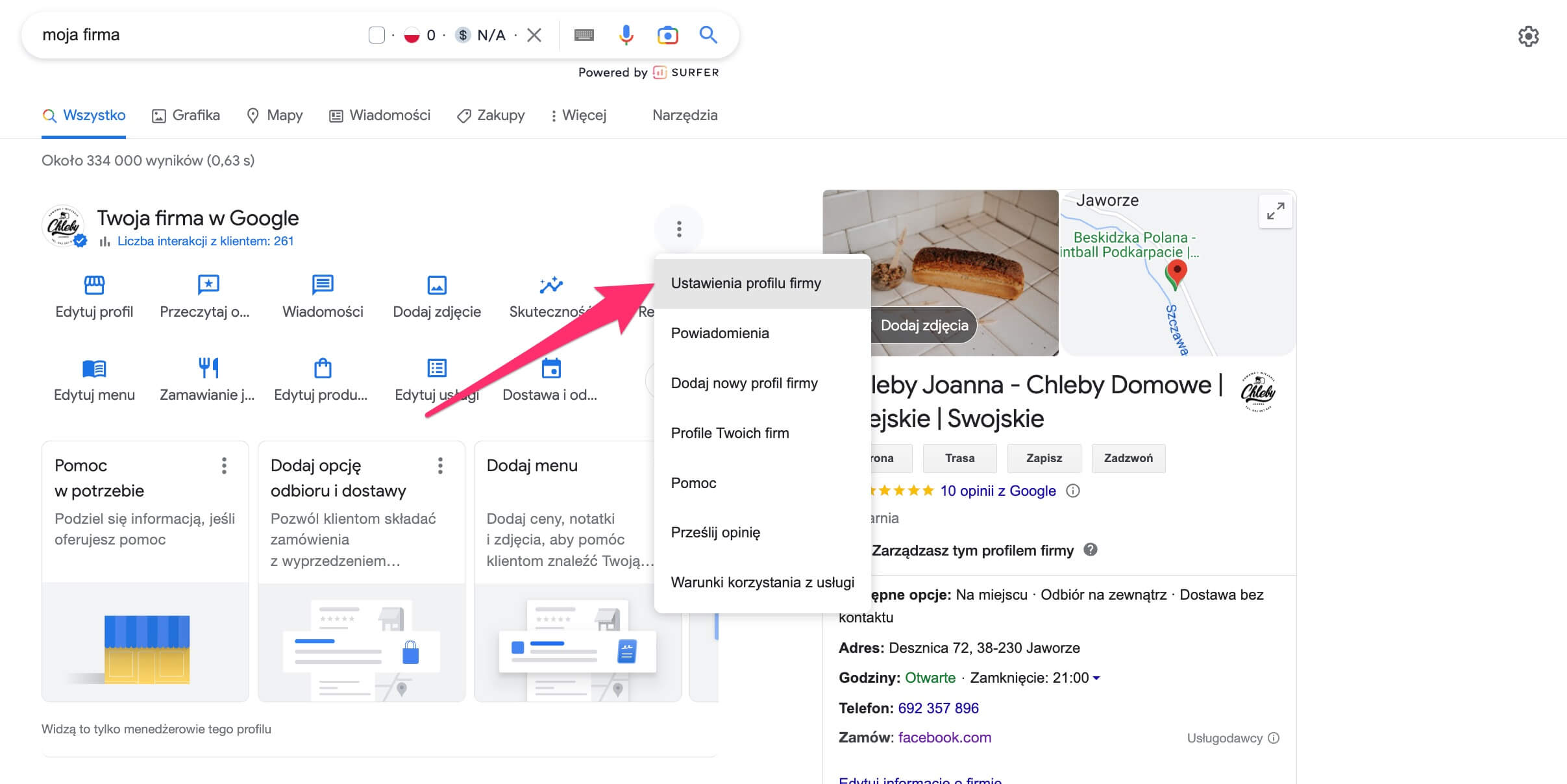 Na samym początku musisz wyszukać swój profil biznesowy (Google Moja Firma), do którego masz dostęp i którym możesz zarządzać w Mapach Google i wyszukiwarce Google. Aby to zrobić, wpisz dokładną nazwę firmy w wyszukiwarce Google lub „moja firma”.