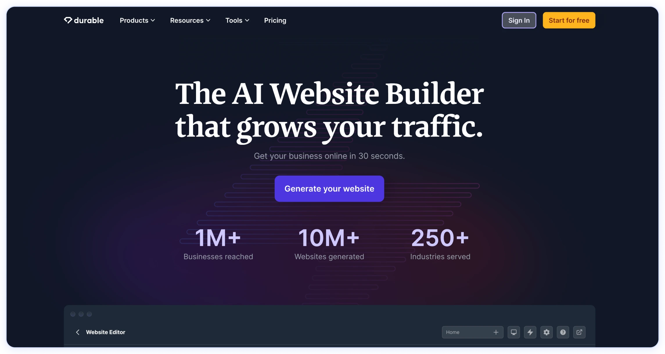 - Przegląd: Durable AI tworzy strony biznesowe w mniej niż 30 sekund, używając narzędzi opartych na sztucznej inteligencji do automatycznego generowania treści, układu i struktury.
