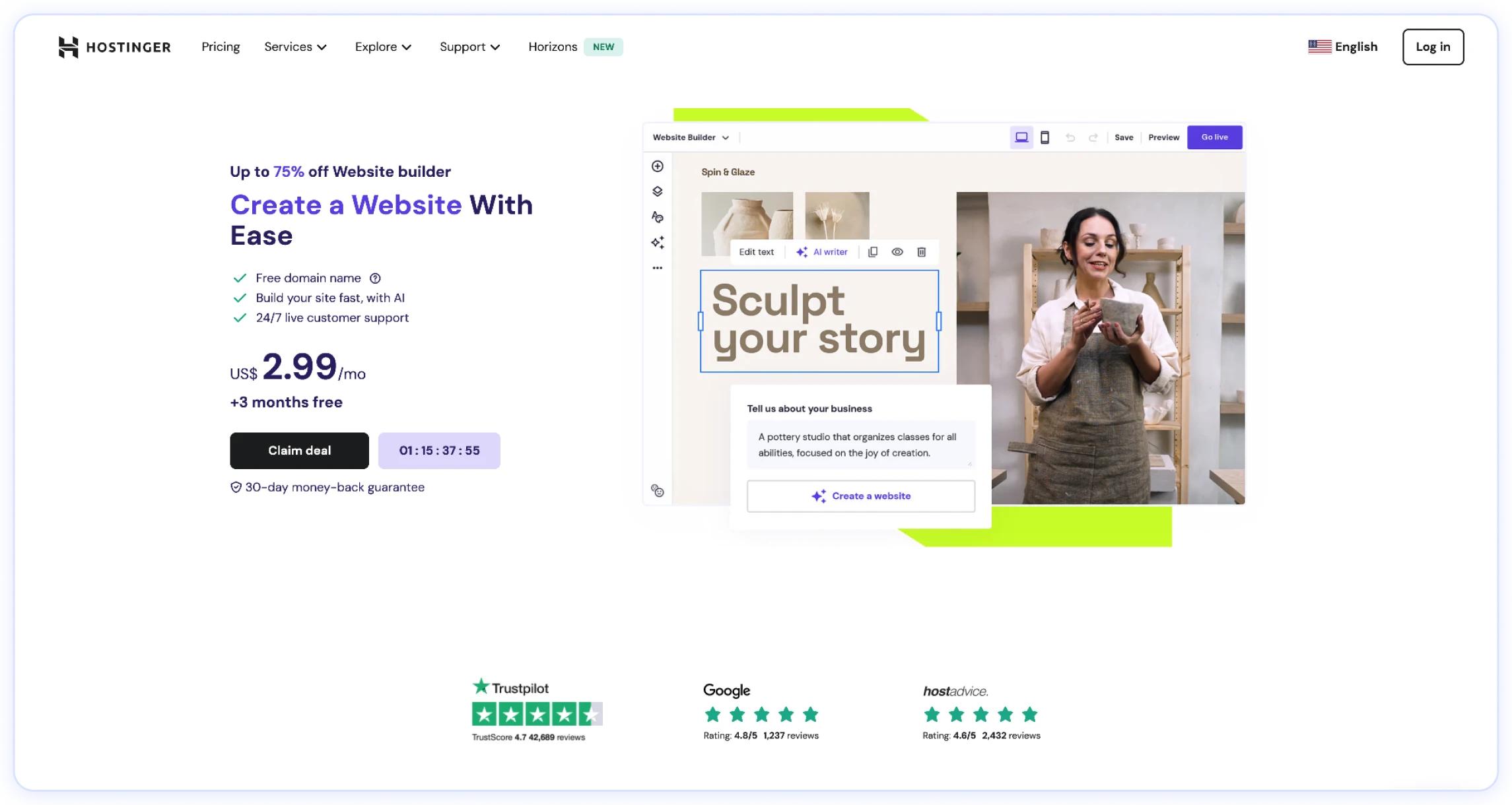 - Przegląd: Hostinger Website Builder, dawniej znany jako Zyro, integruje narzędzia oparte na sztucznej inteligencji, aby pomóc małym firmom i osobom prywatnym projektować atrakcyjne wizualnie strony internetowe przy minimalnym wysiłku. Oferuje generowane przez sztuczną inteligencję teksty i obrazy, aby usprawnić tworzenie treści.