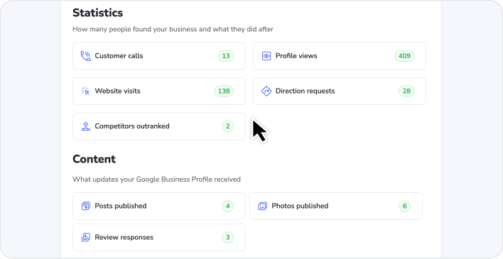 Klienci widzą, że publikowałeś treści, odpowiadałeś na opinie i dodawałeś nowe wpisy do katalogów tuż obok zwiększonej liczby połączeń i wyższych pozycji. Wszystko, co chcą wiedzieć, w jednym raporcie gotowym w parę sekund.