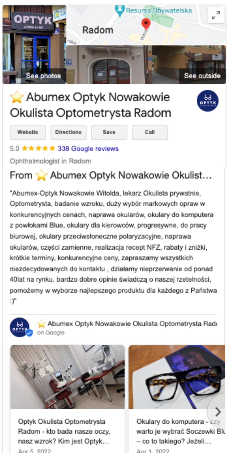 Później zaczęliśmy się zastanawiać, jak ulepszyć nasz profil firmowy w Google? Jak nim zarządzać, aby zwiększyć widoczność profilu naszego salonu optycznego w Google?