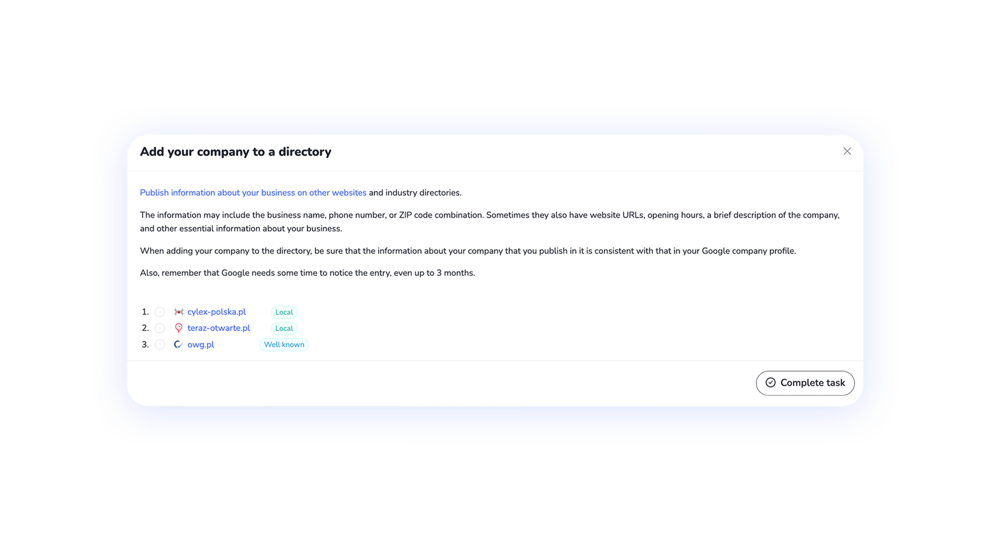 No Localo: você recebe uma lista pronta de sites em que seus concorrentes são publicados e, portanto, têm uma classificação alta no Google Maps. Siga a lista e você poderá adicionar 1, 2 ou 3 desses sites a cada semana. Você não precisa fazer tudo de uma vez, e nem deveria.