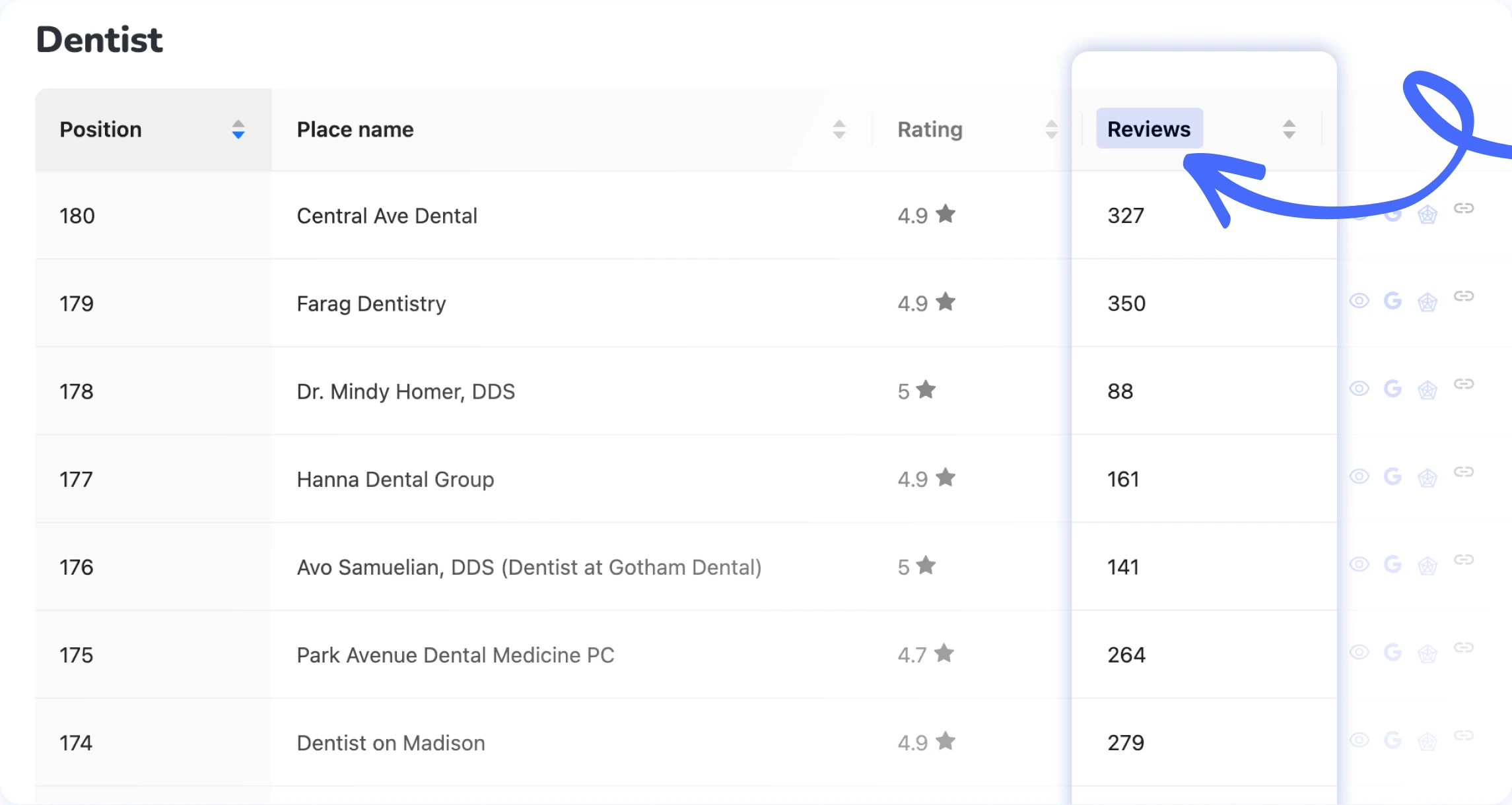 Agora você pode classificar instantaneamente clientes potenciais por contagem de avaliações para encontrar empresas que mais precisam do seu suporte. Empresas com menos avaliações geralmente são os melhores candidatos para clientes que você realmente pode ajudar a melhorar sua visibilidade online.