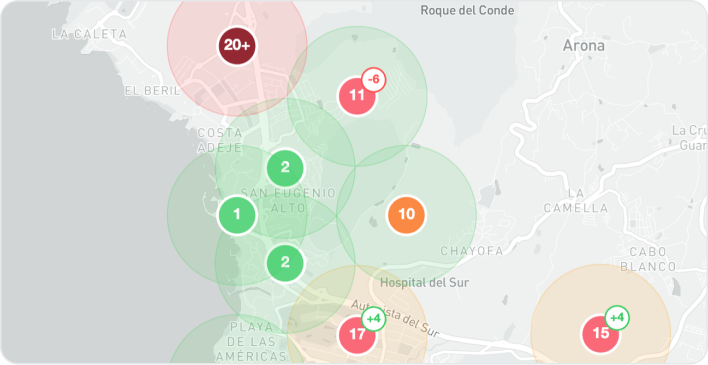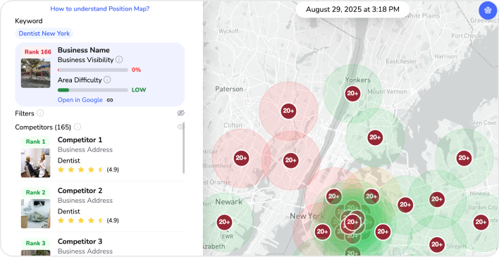 Pontos verdes significam posições altas no Google. Vermelhos significam baixa visibilidade entre clientes que estão buscando. Laranjas significam negócios quase invisíveis. Você vê um cliente potencial na posição 20+ em uma área pouco competitiva? Perfeito.